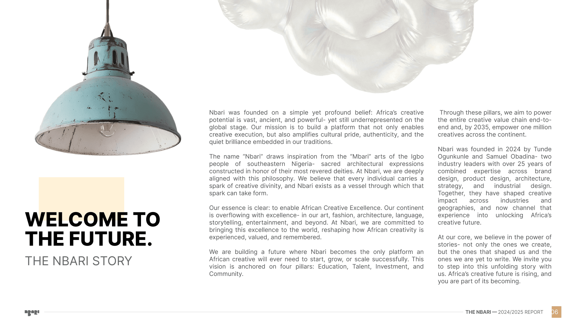 Nbari was founded by industry leaders, Tunde Ogunkunle and Samuel Obadina, who bring over 25 years of combined expertise in brand design, product design, architecture, strategy, and industrial design.